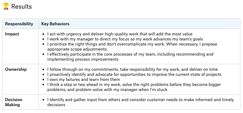 🚨 Review these expectations first. It will end up being a big waste of time if your manager has a different interpretation of what's expected at your level than you do. Sometimes wording can be vague, so get on the same page with your manager about any details that could be taken to mean different things.